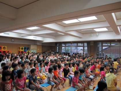 祇園祭で臨時休園をしたので、今日が1学期の終業式です。幼稚園にすっかり慣れてきた年少さん、元気いっぱいの年中さん、4月からよく遊びましたね。成長をとても嬉しく思っています。皆様ありがとうございました。そして終業式の後、年長児は年中児年少児に見送られて慌しく花脊山の家に宿泊保育に出かけます。先生達も先発隊と後発隊に分かれます。花脊で合流です。雨ふりなので、バスのところまで保護者の方と一緒に移動です。お天気になりますように!みなさん、行ってきま〜す。