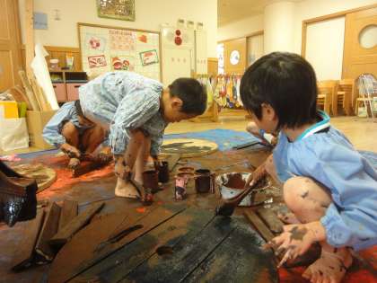 鉾の骨組みができて,喜ぶ子ども達でしたが,祇園祭のビデオを観てから,「あ!屋根をつくらなくちゃ!」「胴掛けもきれいなものつくろう!」「提灯もつくって飾ろうよ」と,子ども達の気持ちはワクワクしています。