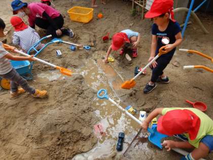 水が流れたあとは、濡れた砂で硬い山をつくろうとする子ども、船を浮かべてみる子ども、水が流れるところをもっと大きくしたい子ども、それぞれが思いをもって遊んでいました。