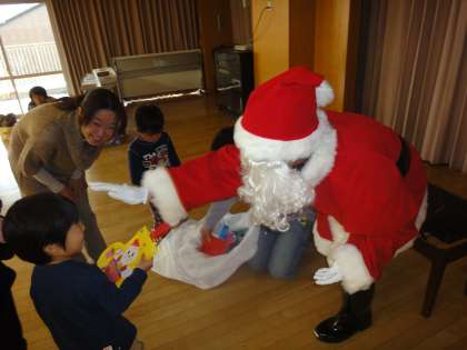「ジングルベル」や「おもちゃのちゃちゃちゃ」にあわせて、鈴を鳴らしたり、いつも大好きなアンパンマン体操をしたりして、遊んでいると、サンタさんがやってきました。