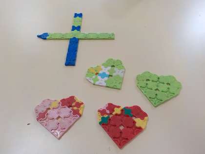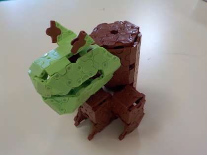 最初はパーツをつなげて遊ぶことから始めて,だんだんと平面で形を作れるようになり,時間をかけて立体の作品にも挑戦しています。
