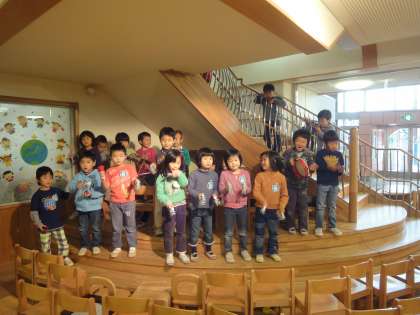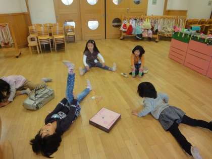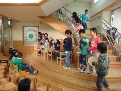12月に入り,子どもたちの気持ちは,すっかりクリスマスムード!部屋でクリスマスソングをかけていると,鈴やカスタネット,タンブリンなどの楽器を手に持ち,クリスマスコンサートごっこが始まります。「お客さんにも見てほしい!」という思いがあって,今日は1階のステージですることになりました。コンサートが始まると,「私は星の妖精になって踊りたいな」と言って,リズムに合わせて踊る姿も見られました。次々と踊りたい女の子たちがやってきて,「もっと上手に踊れるように体操しよう!」と言って柔軟体操もしていました。