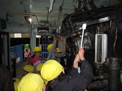 京都駅まで地下鉄で行き、そこからJR線の脇道を40分かけ歩いて行きました。道中いろいろな列車が通るたびに「わぁはるかや!」「新幹線が走ってる」「快速電車や」「今度は貨物列車が来た」「また来たよ」「僕、この電車乗った事あるでぇおばあちゃんとこいくし」など大喜びです。機関車館では実際走っている機関車の煙突から白や灰色の煙が勢いよく吹き出ている様子を見ていたAちゃんが曇ってきた空を見上げて、「機関車のけむりで曇ってきたのかなぁ?」とつぶやいていました。また展示してある機関車の器具や機械を触ったり、廻したり、押したりと目を輝かせて興味深々で楽しんでいました。子ども達は心躍る一日だったことでしょうね。