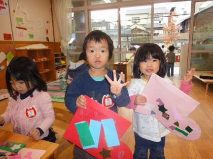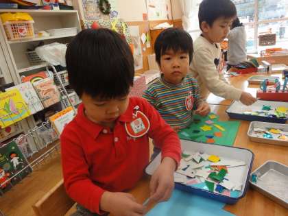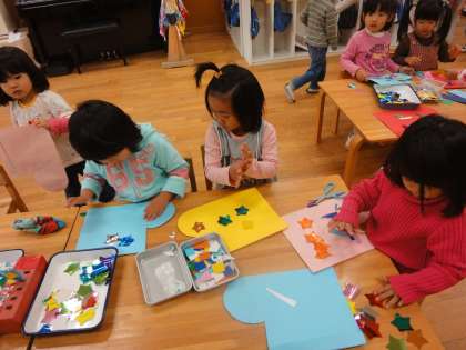 キラキラの☆や、△、□の飾りをつけたり、クレパスで絵を描いたり・・・