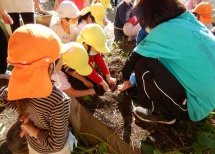 幼稚園の畑で育てていたサツマイモを2日(水)に収穫しました。「おっきいの掘れた!」「人参みたいなかたち!」といろいろな大きさや形のおいもがとれて、とても嬉しそうでした。