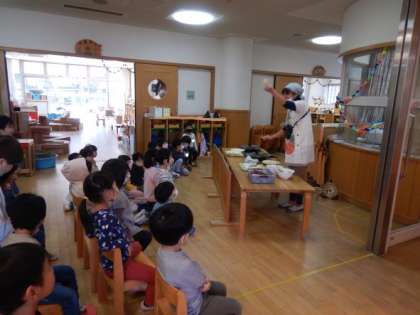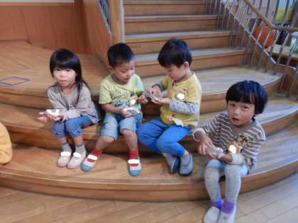 みんなで洗ったサツマイモを、やいて食べました。「皮は赤紫色、皮をむくと黄色」と色の違いに気付いて友達や先生と話をする姿もありました。ホールいっぱいに、いい匂いがして「早く食べたい!」と楽しみな子どもたちに味見をしてもらうと・・・「すっごくおいしい!」とのこと!お弁当の時にもたくさん食べました。「ふわふわ」「甘い」「幸せな味がする」など十分に味わっていました。自分たちで収穫したおいもの味は特別だったようですね。
