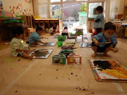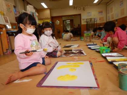 今日はサツマイモの絵の具遊びをしました。幼稚園で芋掘りやおいもパーティーをしたり、絵本を読んだりした経験をもとに遊びました。手や筆などを使って何色も重ねたり、土の中の様子やいろんな形のイモをかいたりすることを楽しみました。「おっきいおいもをかいたよ!」「顔の形のおいも」など一人一人思いをもって表現することを楽しみました。