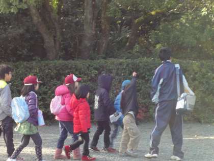 グループに分かれ、最初は緊張した様子の年長児も、小中学生に優しく声をかけてもらっていました。