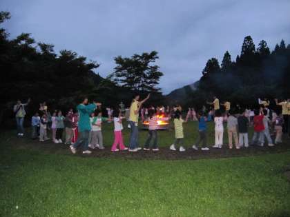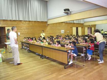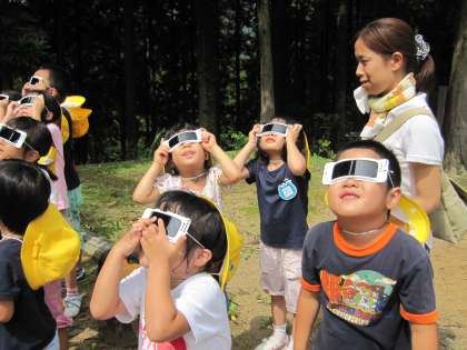 7月21日〜22日に年長児が宿泊保育にいきました。花脊の工房の方から木の話を聞いたり、キャンプファイヤーで「中京もえぎ音頭」を踊ったりしました。大樹くんに上がったり、アスレチックコースを降りたりして散策をしながら、日食観察をしました。時間の経過と共に少しづつ太陽が欠ける様子を興味いっぱいに見ました。「あ、かじられてる!」と発見してから、半分になって、細い細いバナナになるまで約1時間、思い出に残る時間を過ごすことができました。二日間みんな元気に過ごせたのが何よりでした。花脊のみなさん、みなさんありがとうございました。