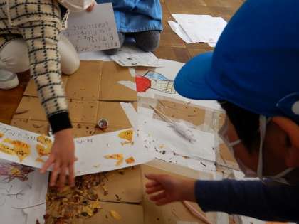 1年生が秋の自然を使ってお店を考え、年長児に向けて招待の手紙や動画も送ってくれました。