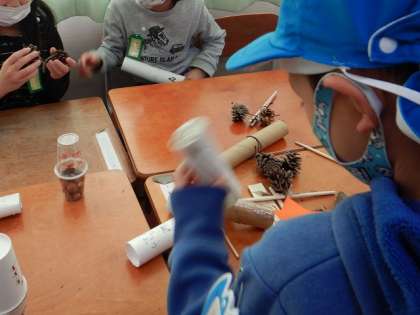 子どもたちとわくわくしながら教室に入ると、どんぐりやまつぼっくりなどでつくった、アクセサリーや服屋さん、楽器屋さん、転したり的に当てたりするゲーム屋さんなど色々なお店がありました!