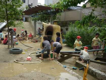 ・教師は子どもに温かくかかわっているが,人数的に子どもが多すぎて十分にかかわれていないのではないかという声を聞く。教職員数には限りがあるので,ティーム保育を推進したり,学生ボランティアを活用したりして,一人ひとりの子どもの姿を見取るように努めている。また,週及び日の指導計画を作成し,一人ひとりの遊ぶ姿を予想し,教師の援助や環境構成について考えて,教師側もポイントをおさえて丁寧にかかわるよう努力している。