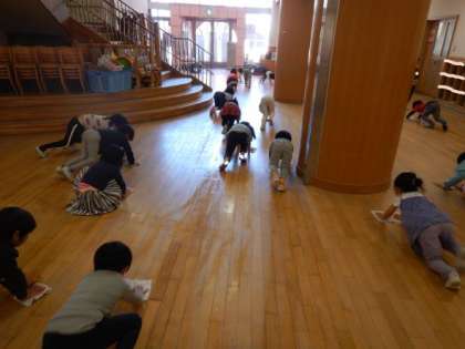 今日は4歳児でごみゼロ隊をしました。先月、5歳児と一緒にごみゼロ隊をして「次からよろしくね」と引き継ぎをしてもらっていました。明後日が修了式なので、遊戯室や2階、階段などを雑巾がけしました。「おっきい組さん、喜んでくれるかな」「ピカピカすぎてびっくりするかも!」と話しながら隅々まできれいに掃除しました。