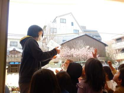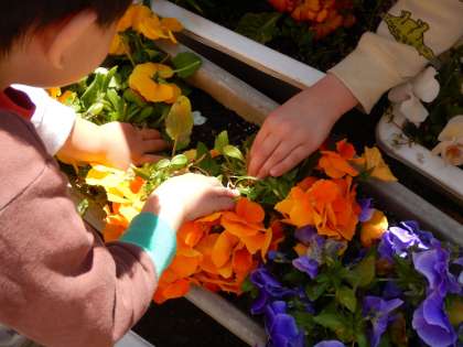 降園前に、2匹の蝶をみんなで空へとばしました。1匹は元気にとんでいきましたが、もう1匹はなかなかとべない様子です。子どもたちはに蝶に向かって「がんばれー!」と声をかけますが、それでもとびません。そこで、園庭のプランターの花の所に、なかなかとべない蝶をそっとのせてあげることにしました。「とぶかなあ」と心配しながら、プランターの花を分けて覗き込む子どももいました。