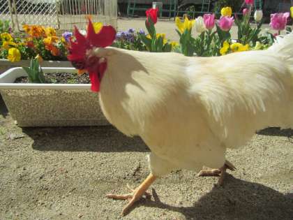 また,園庭では子ども達がお世話をしていた,ちゅうりっぷが咲き始めましたよ。色とりどりでとってもかわいいです。その可愛さに惹かれたのか,花の近くをにわとりのレモンちゃんが今日はお散歩をしていました。