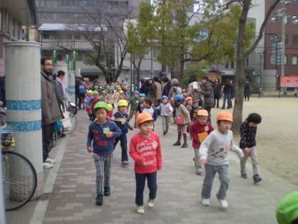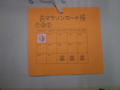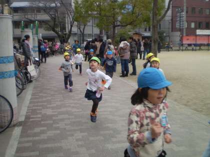 年少組は園庭を走ります。走る前は「寒い寒い」と言っている子どもも走りだすと、「何だか体がポカポカしてきたわ」と言っていました。お母さんたちの応援のもと、子ども達は2月の終わりまで毎日走る事にしています。10分間走り終えるとマラソンカードにシールを貼ってもらいます。お母さん達も子ども達と一緒に走ってみませんか?走り終わるときっとすがすがしい気分になり気持ちいいですよ。