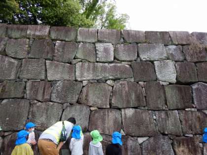 5歳児で二条城へ出かけました。大きな門や高い城壁がいくつもあり、「すごいな」「(門をくぐる時に)ちょっと怖いな・・・」「忍者だったらこの壁、さっと登れるんかなあ」と様々に感じながら見学していました。曇り空で遠くまでは見えませんでしたが、天守閣跡から見える京都の景色をじっくり眺める姿もありました。少し長い距離でしたが、安全に気を付けて歩くこともできました。