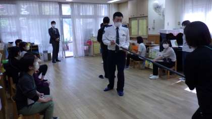 中京警察署の方に来ていただき、園内で防犯について学びました。子どもの命を守るためにどうすることが最善かということを、改めて考える、そして、実際に動く機会となりました。「さすまた」の効果的な使い方等も学びました。あってはならないことですが、日頃より意識をもって保育にあたっていきたいと思います。