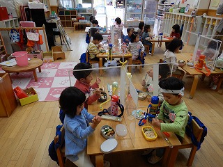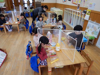 今日は入園してから初めてクラスで食べる弁当日でした。10時くらいから「おなかへった!」「今日はみんなでお弁当食べるんでしょ?」と弁当を楽しみにしている姿がありました。自分で弁当の用意をしたり、きれいに手を洗ったりして、準備万端な子どもたち。一緒に「いただきます」の挨拶をすると、「おいしい!」と笑顔がもれていました。頑張って箸を使おうとする姿もありましたよ。また、次の弁当日をお楽しみに!