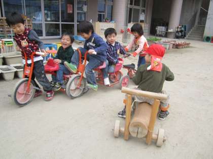 そして園庭では,電車ごっこをしている子もいます。3歳児などお客さんを乗せて目的地へ運びます。お客さんのご要望に応じて,消防車にもなります。
