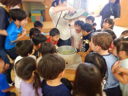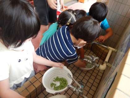 先日3歳児の時に畑に植えたエンドウ豆の最後の収穫をし、今日はみんなで豆ごはんをつくりました。さやから豆を出すと、「出てきた!」「いっぱいある!」と大喜びの子どもたち。出した豆は友達と代わり合って洗い、「美味しくな〜れ、美味しくな〜れ」とみんなで魔法をかけてごはんを炊きました。炊きあがった豆ごはんはほんわかいい匂い。「わ〜」「いい匂いがする」と喜んで覗き込んでいました。お弁当時に小さなおにぎりにしていただくと、「美味しい」「(苦手だったけれど)お豆食べれた」と嬉しそうに食べ、おかわりをする子どももいました。自分たちで育てた豆を使った豆ごはんは、特別美味しかったようです。