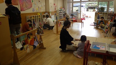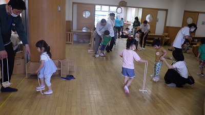 今日は日曜参観があり,お家の方と一緒に朝から降園まで幼稚園でたっぷり遊びました。3歳児は園庭や保育室で好きな遊びを一緒に楽しみました。4歳児は一本歯下駄,5歳児は竹馬づくりをそれぞれ親子で取り組み,できたら早速保育室やホール,公園に出て支えてもらいながら乗ってみる姿がありました。お家の方と一緒に過ごす幼稚園は特別で,いつもとはまた違う嬉しそうな表情がたくさん見られました。今日はお休みの中,ご参加くださりありがとうございました。