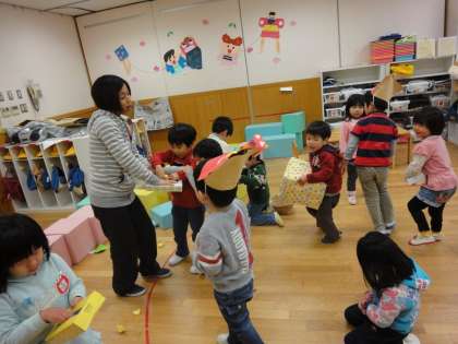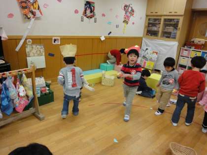 鬼の絵本を読んだときに、少し怖がっていた子どもも、自分が鬼になって豆まきをするのは大好きなようで、とても楽しそうに、笑顔で豆まきをしていました!!