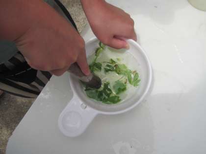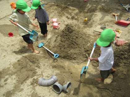 年長組の子ども達が園庭で水や砂で、体を動かしながら遊びました。砂場では「大きな穴をつくるぞ!」と大きな穴を掘っていました。そこから水をたくさん穴に入れて「温泉ができた!」とイメージを膨らませて、砂場が大変身していました。「温泉入ってもいいよ。ちょっとあたたかいよ。」と楽しそうに話していた子どももいました。また、すり鉢とすりこぎ棒を使って水と植物をすりつぶしてじっくり遊ぶ子ども達もいました。「なんだかお薬みたい」「お茶の色になってきた」とすりつぶした植物で水の色が少しずつ変化していることに気づく姿もありました。その他にも滑り台から水を流してウォータースライダーをしたり、足を泥につけて感触を楽しみながら好きな遊びをしていました。