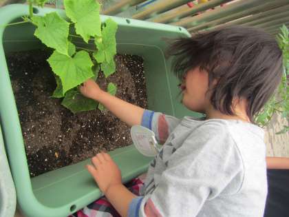 年長組の子ども達は毎朝、自分の身支度が終わると野菜に水をやりに行っています。2週間ほど前からグループで育てたい野菜を決めて、育てています。育てている野菜にはきゅうり・赤ミニトマト・黄色ミニトマト・ピーマン・小豆・オクラ・刀豆などがあります。種から育てている小豆は芽が出た時「かわいいあかちゃんが出てきた!うれしいな。」と大喜びの子どもの姿がありました。また野菜の様子を見ながら「今日は雨が降るから水はいらないよ。」や「水をあげすぎたら、溺れちゃうかな?」と少しずつ大きくなっている様子を見て考えを伝え合っていました。野菜が大きくなっていくのが楽しみだね。子ども達の”なんでかな?”という思いに耳を傾けて一緒に考えていきたいと思っています。