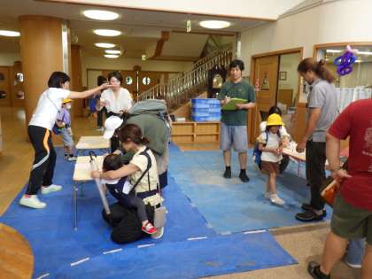 今日は台風による暴風大雨警報発令、鴨川氾濫のおそれ という設定で、引き渡し訓練をしました。1階が浸水するという想定で、全園児が2階で迎えを待ちました。連絡を発すると、訓練の意義をみなさん理解していただき、無事に引き渡しをすることができました。子どもたちも、静かに避難行動をとることができていました。
