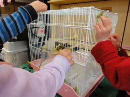 保育室にいるインコのリボンちゃん。
