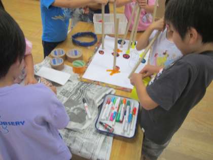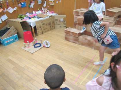 昨日の夏のつどいでおうちの人が用意してくださった、楽しかった遊びを「また、やってみたい!」「子ども達だけで、輪投げを作りたい!」と話し、さっそく作ってやってみようと挑戦していました。何で作れるか材料を探し、友達と話合いながら作っていました。「輪投げの引っかかる棒はどうやったら紙とくっつくかな?」「ガムテープがいいかな?」と、アイディアを出し合っていましたよ。作り終わると「できた!」と大喜びでした。完成したらさっそく、輪投げをして嬉しそうに遊ぶ子ども達でした。