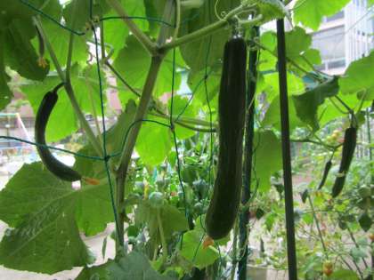 みんなで育てている、夏野菜がすくすく育っています。真っ赤なミニトマトの実もたくさんありましたよ。きゅうりも、たくさん実がなっています。幼稚園の近くを通られた際や園庭開放などで、ぜひ見に来てくださいね。