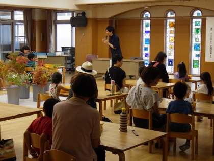 8日の今日は分科会がもえぎ幼稚園でありました。未生流笹岡家元の笹岡隆甫先生にご指導いただき「親子いけばな体験」をしました。とても楽しい時間を過ごしました。「素敵な時間でした」「家に帰ってから、毎日お花とお話しするって(子どもは)言ってます」等、保護者から感想が聞かれていました。午後からは全国から来られた幼児教育に携わる先生方が生け花について実際に体験しながら、たくさんのお話を伺いました。とても学びの多い有意義な時間でした。