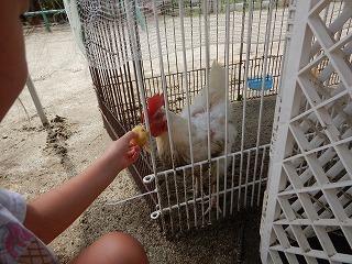 台風で園庭の桃がたくさん落ちています。桃をニワトリにやってみると、とてもおいしそうにぱくぱくと食べていました。