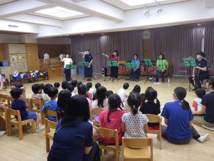 みんなの大好きな曲を演奏していただき、本当に楽しい時間を過ごしました。トランペットやトロンボーン等の楽器紹介や手遊び等もしていただき、子どもたちもとてもいきいきと参加していました。これからも預かり保育の時間に、様々なボランティアの皆さんにお世話になりながら、楽しい経験をしていきたいなと思います。