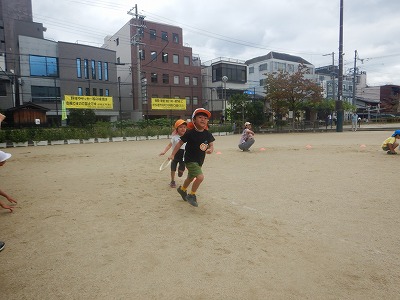 5歳児は、運動会では2クラス混合チームでしたが、昨日今日は久々のクラス対抗でリレーをし、抜きつ抜かれつ勝ったり負けたりで、熱く盛り上がっていました。