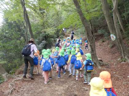 今日は4・5歳児で大文字山へ園外保育へ出かけました。出発時は天気が少し心配でしたが、天気ももち、楽しみながら自分のペースで歩いて登っていました。道中では、シカやバッタを見つけたり、水や風の音を聴いたり自然に触れる姿もありました。頂上から見る景色はとても素晴らしかったです。また、景色を見ながら食べるおにぎりは特別おいしかったようです。