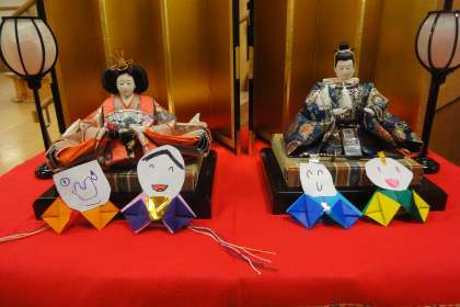 そして,ひなまつりが近づいてきたので,おひなさまも飾りました。子どもたちも,折り紙を折って着物をつくり,顔を自分で切ってかいて,おひなさまとおだいりさまをつくりましたよ。