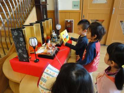 年中組ではおひなさまをつくる時に,実際に飾ってあるおひなさまを見に行って