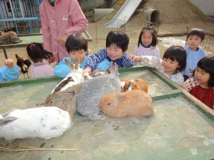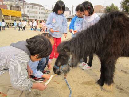 幼稚園前の竹間公園と園庭には,ポニー,ヤギ,ブタ,アヒル,ウサギなど・・・いろいろな動物が,子ども達を待っていてくれました。