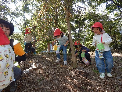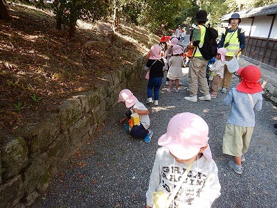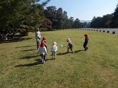 今日は、初めて園外保育に京都御苑に行ってきました。一人一つずつお散歩バッグをもって、「どんぐりあるかな?」「松ぼっくりほしいな」「虫いるかな?」と、とても楽しみにしていた子どもたちです。道中は、5歳児のお兄さんお姉さんに手をつないでもらい、パパママティーチャーのお母さん先生にも見守ってもらって、みんな上手に歩いて行って帰ることができました。御苑では、大中小、真ん丸・長丸・細長、緑や茶色など大きさも形も色も様々などんぐりに出会うことができ、夢中になって拾ったり、バッグに集めたりすることを楽しんでいました。広い野原では、バッタやコオロギ、チョウにも出会い、秋の自然にいっぱい触れて大満足の子どもたちでした。パパママティーチャーでお手伝いいただいたお家の方、ありがとうございました。