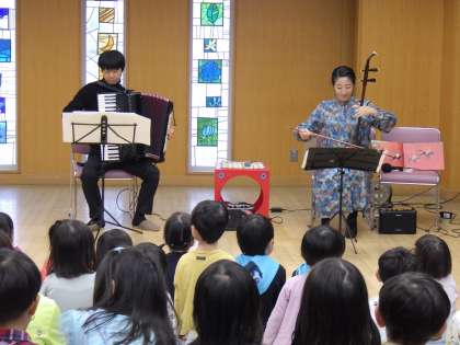 今日は、二胡奏者の吉川普子さんとアコーディオン奏者の宇根章浩さんが幼稚園に来てくださり音楽会がありました。モンゴル民謡や「どんぐりころころ」や「さんぽ」等々子どもも大好きな曲を演奏してくださいました。二胡が馬の尻尾の弓やへびの皮を使ってできた楽器であることや、アコーディオンの中にはたくさんの笛が入っていることなどを聞き、興味深く子どもたちも聞いていました。元気に歌ったり、素敵な音色にしっかり耳を傾けたりしている姿が見られていました。