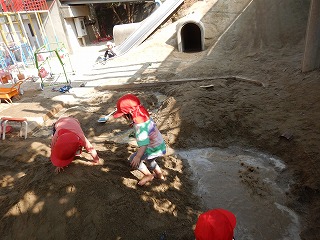 季節外れの暑い日が続いていることもあり、砂場でどろんこ遊びを楽しんでいます。スコップで穴を掘ると、「水を入れよう!」と次は水をたくさん運びます。水が溜まってくると、「プールになってきたね」と嬉しそうな子どもたち。プールにジャンプしたり、山に登ったりとダイナミックに遊んでいます。