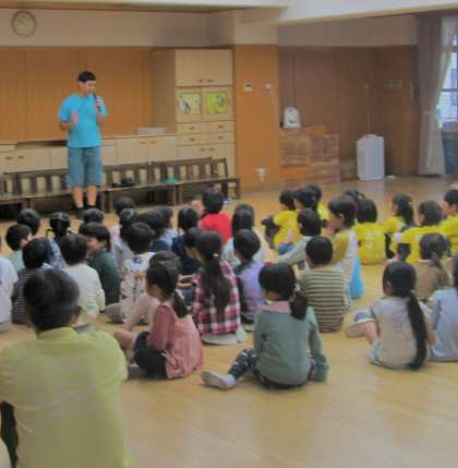 実は、今日遊びに来てくれた年長組さんは来週に予定している、幼稚園大会で一緒に舞台の上で遊ぶ仲間なんです。今日、初めて歌や踊りを一緒に楽しみました。「また来週まで元気でいてね。」「また遊ぼうね。」と玄関に声を届け別れをさみしく思いながらも、また会えるのを楽しみにしていました。