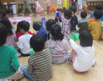 見たり聞いたりしていた先生や友達から「素敵だったよ。」「見ていて楽しくなった!」と言ってもらい喜んでいました。「また見せてね。」と言われて手を振る姿もありました。来週の幼稚園大会では大きなコンサートホールの舞台で遊ぶことを先生から聞き「早く来週にならないかな?」と楽しみにしている子ども達でした。