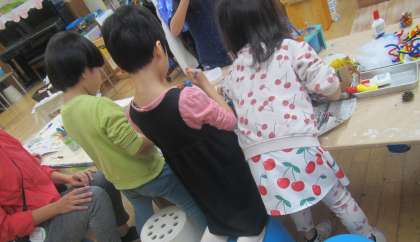 交流前に先生から、「今日も小学校のお兄さんお姉さんとテレビで繋がるよ。」と聞きました。それを聞いて子どもたちは「松ぼっくりの飾りを見せたい!」「今日もあの時のお姉ちゃんが出てくるかな?」と、とても楽しみにしていました。小学生のお兄さんお姉さんに見せたいと、一生懸命に作ったり、テレビの前に作ったものを見せ紹介したりする場面がありました。