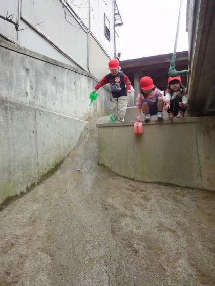 小屋にいくまでの坂に水を流した子が流れている様子を見て…