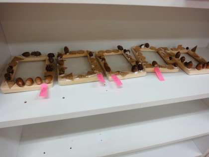 秋に親しんだ木の実です。自分なりに工夫して立てたり倒したりしながら貼りました。