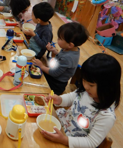 今日は、4歳児が育てて収穫した大根を使ってお味噌汁をつくっていただき、お弁当の時間に全学年でいただきました。